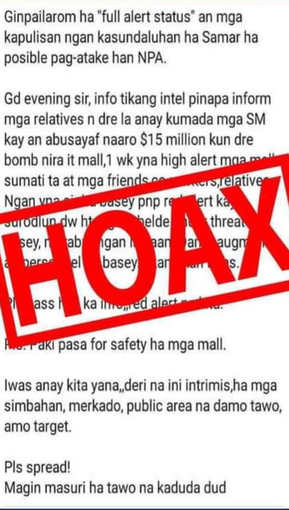 The circulated fake news, written in Leyteño-Samarnon (Waray) language, told the public that the police and military forces in Samar are in “full alert status” over possible attacks by the NPA.