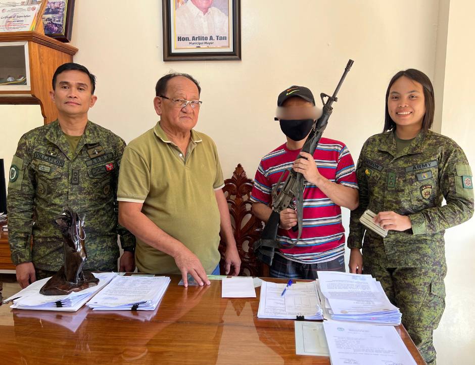 The three NPA and supporters were identified as Alias Rion, member of Squad 1, Platoon 2; Alias Bunso, member of Squad 1, Sub-Regional Guerilla Unit (SRGU), and Alias Ekgong, Yunit Militia and Courier, all belonging to the remnants of Front Committee-15 (Dismantled), Sub-Regional Committee (SRC) Arctic, Eastern Visayas Regional Party Committee (EVRPC). They have surrendered one (1) M16 Rifle with one (1) short magazine and fifteen (15) ammunition; one (1) Caliber .38 Revolver; and one (1) Ingram M10A1 .45 ACP with one (1) long magazine.