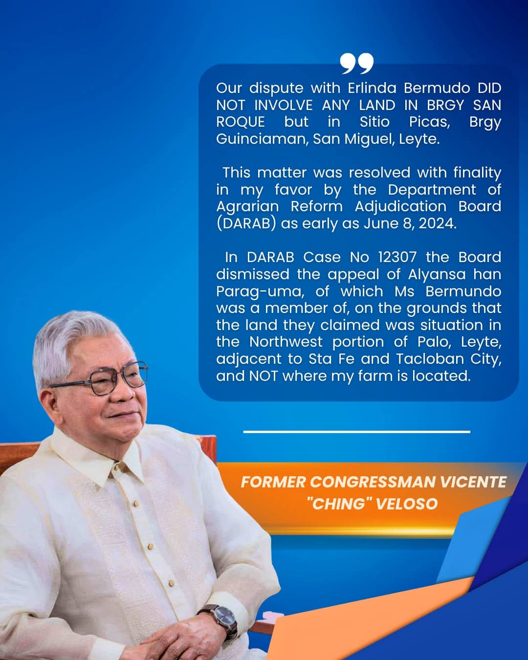 According to Veloso, the Department of Agrarian Reform (DAR) already resolved the Bermejo-Veloso land dispute in 2014, ruling in favor of his family.
